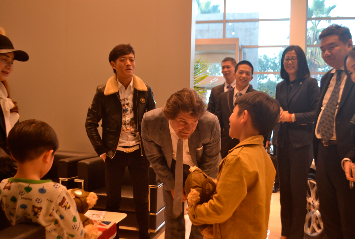 彼夕乐先生为幸运客户的孩子送上小礼物和名片,逗趣十足