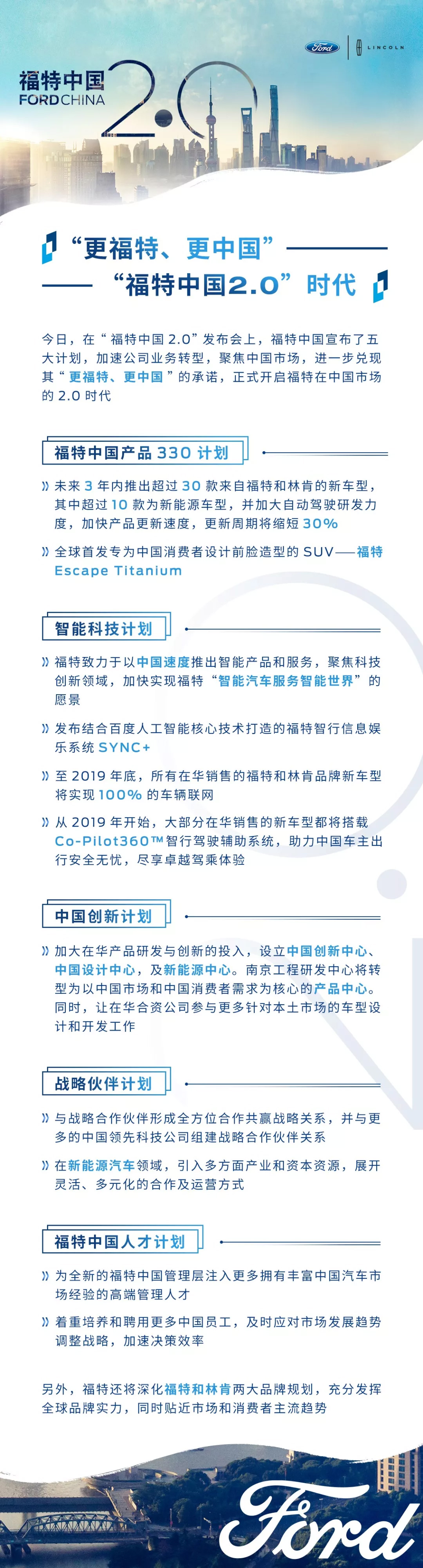 今天,福特汽车公司在 “福特中国2.0”发布会上,宣布全新的业务提升计划,加速公司业务转型,聚焦中国市场,进一步兑现其“更福特、更中国”的承诺,正式开启福特在中国市场的2.0时代。